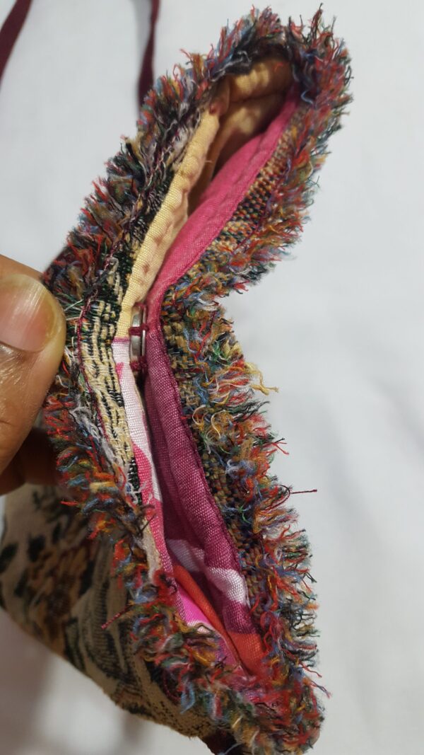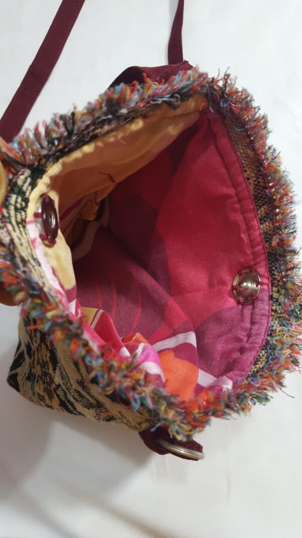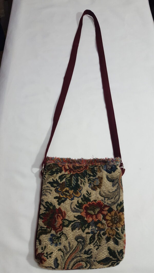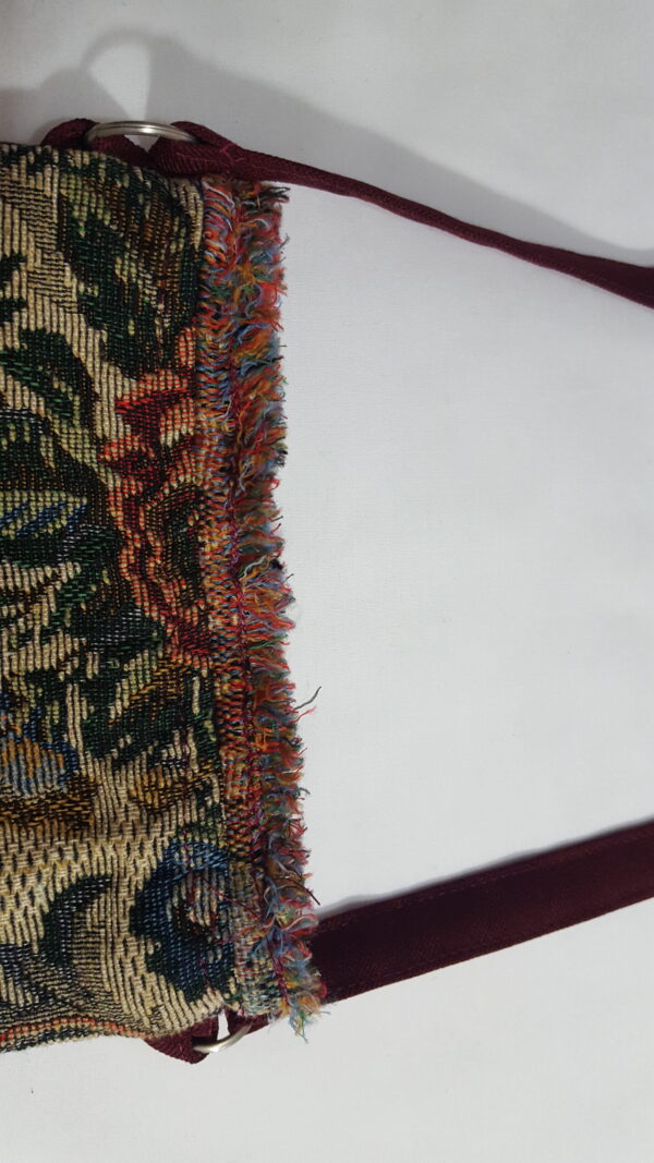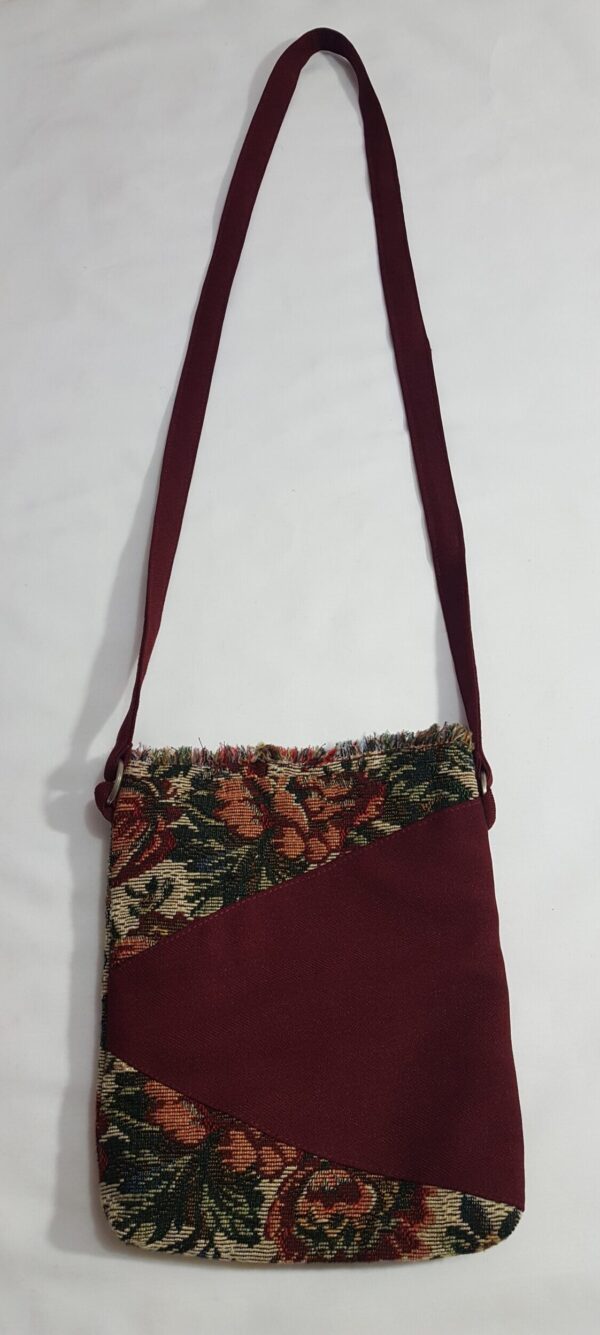 - Color: Burgundy and multicolored tapestry pattern