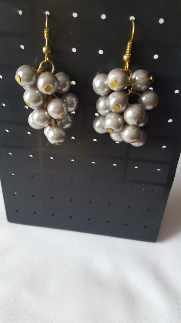 A dangling pair of earrings with bunches of grey beads