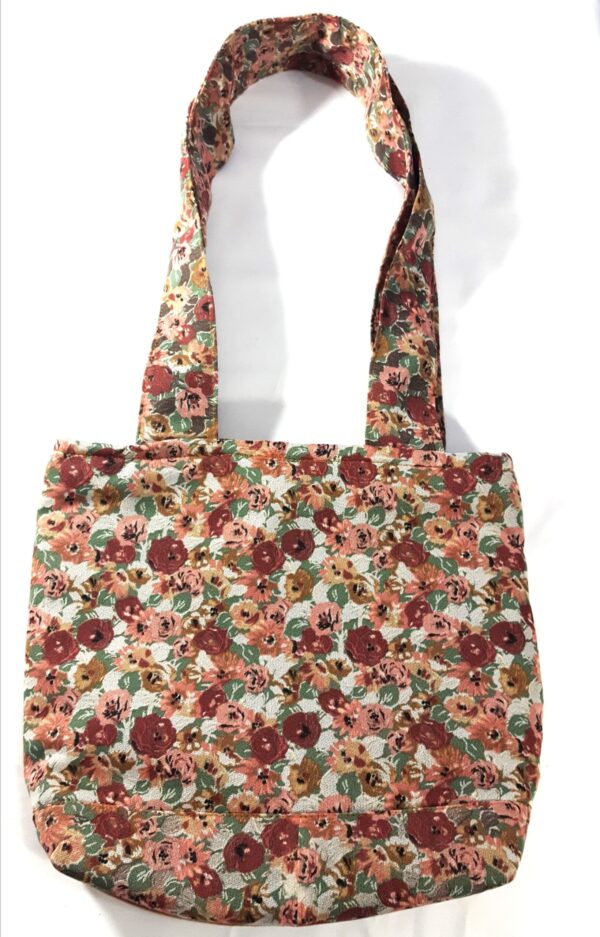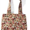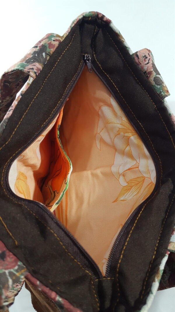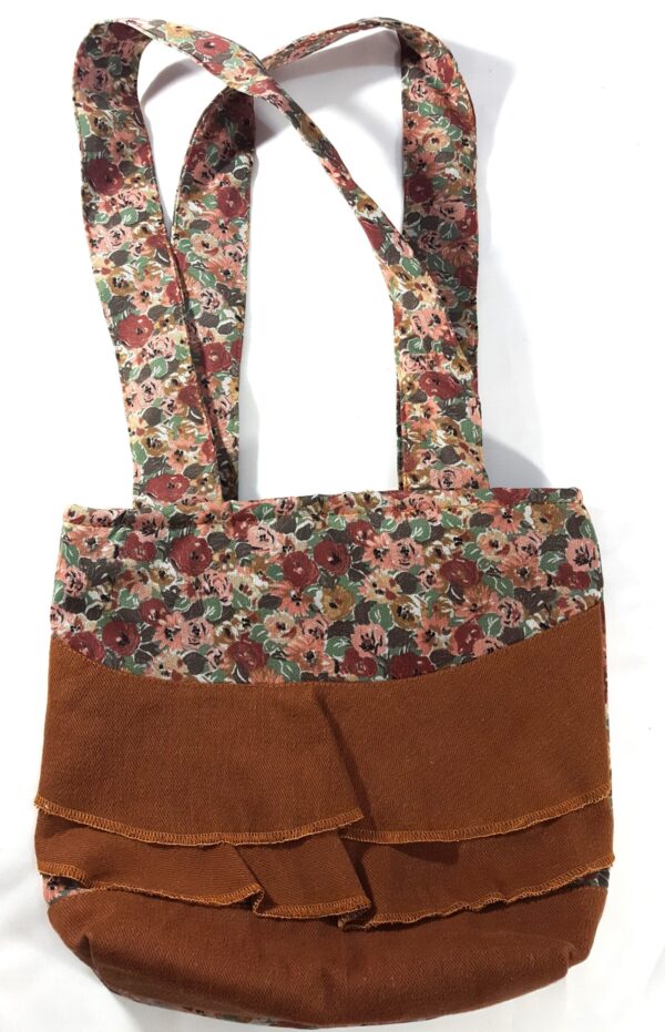 A floral print brown bag with double-frills
