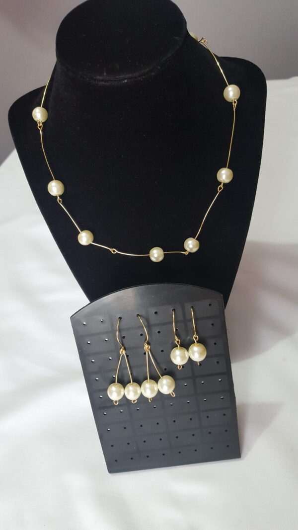 Set includes 1. Necklace, 1. Pair of Dangling Earrings and 1 Pair of Single pearl earrings