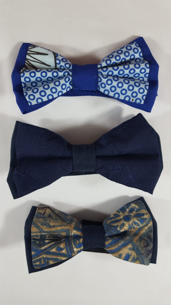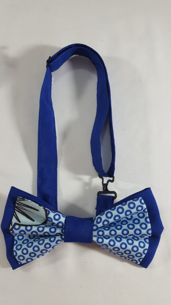 • One Light Blue African Print and Dark Blue Bow-tie 3 inches by 5.5 inches – Fabric adjustable strap to fit neck 16 inches with Bow-tie Clamp