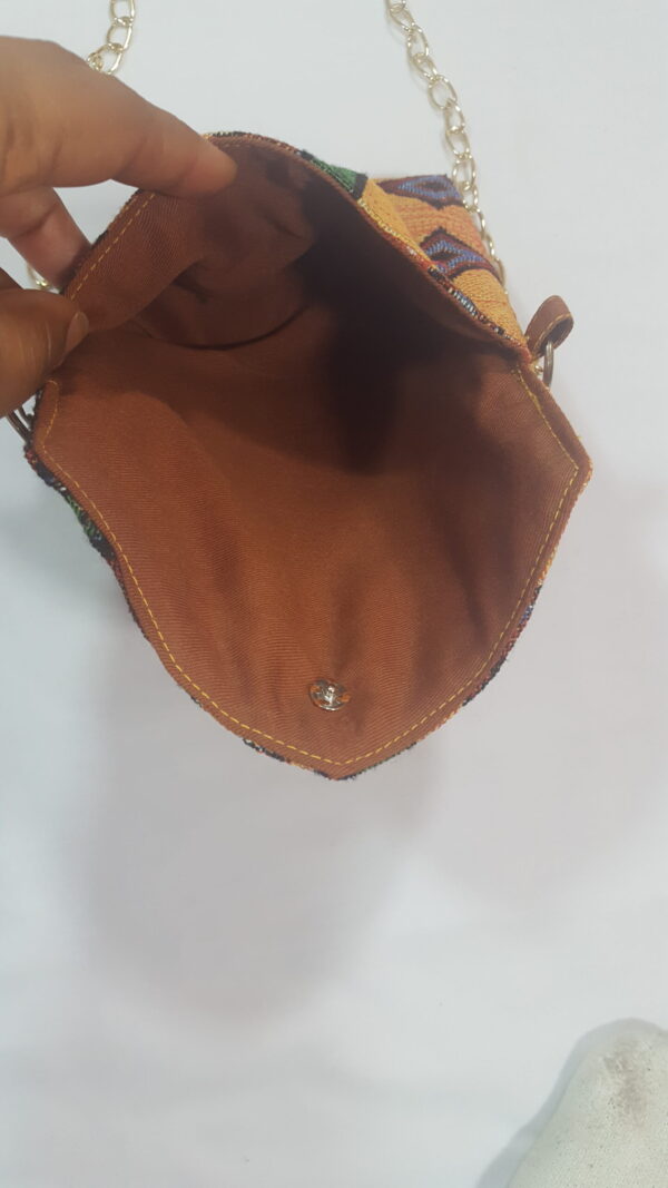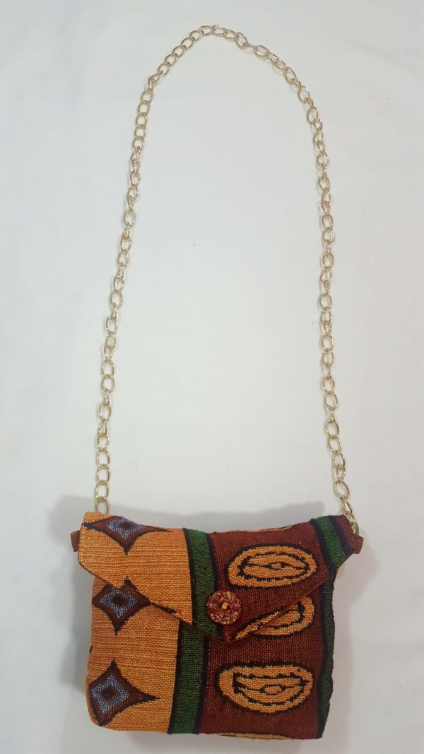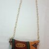 This dark brown and tan African print abstract chain purse is a fantastic and stylish creation.  Dressing you up for every occasion. The purse keeps your items safe, and it matches well with a denim outfit or formal wear. The purse has a gold-colored, chain-link strap.