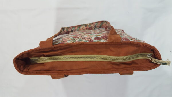 Brown-themed stylish over the shoulder bag with floral print to take anywhere with you. Excellent for casual wear.  Helps you dress in style and keeps your items safe with a zipper closure. Perfect to give as a gift.