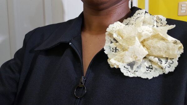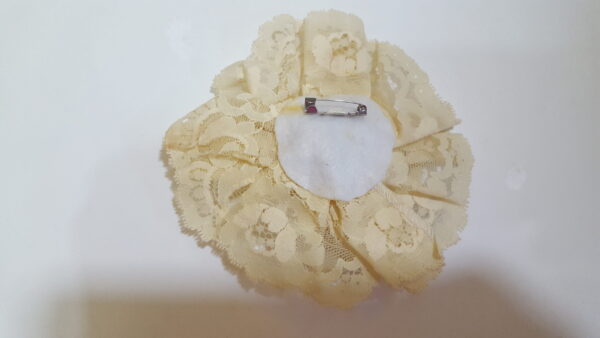 Lemmon Colored Lace Rosette. Broach pin to the back. Just as in the photo accessorize your outfit and add to your style and swag.