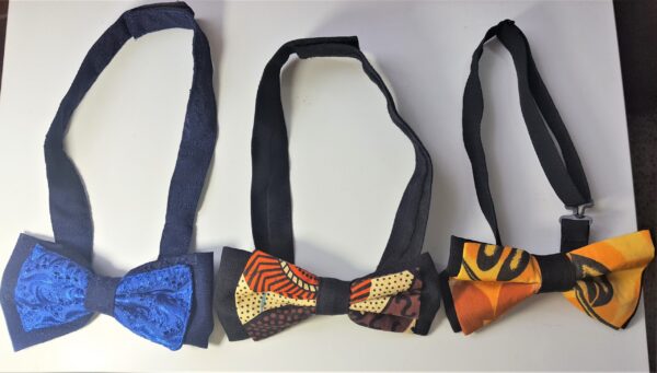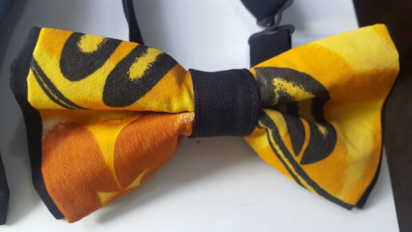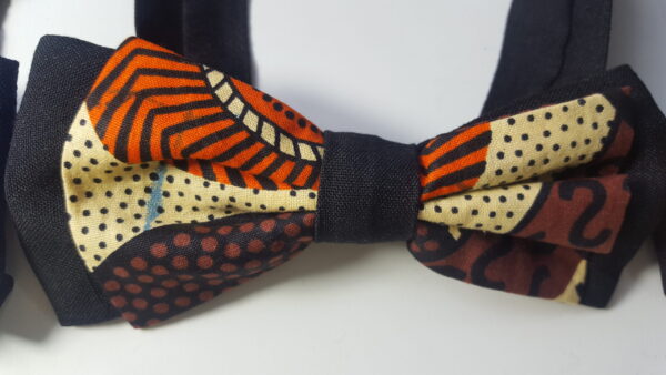 - 2. Measurement: Orange and Black African Print: 6 inches by 3 inches – Adjustable fabric straps 20 inches long with Hook closure