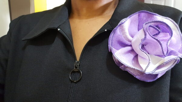Purple and White Rosette Broach. Broach pin to the back. Just as in the photo accessorize your outfit and add to your style and swag.