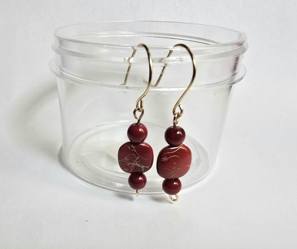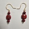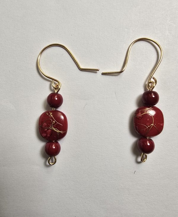 Red And Gold Abstract Pattern, Beaded Handmade Hanging Wire Earrings