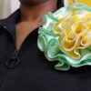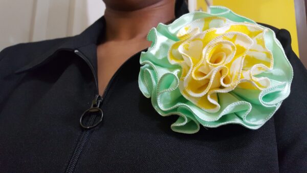 Green, Yellow and White Satin Rosette Broach. Ideal for accentuating your outfits. Just look at how the Rosette in this video changed the look of this hat. https://www.youtube.com/watch?v=OjVBfrg9qs0