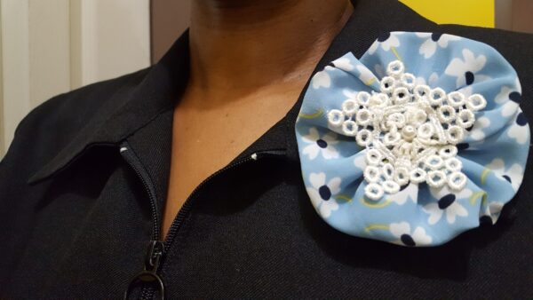 Silk Rosette Broach, Lace Center With Decorative Pearl – (Navy-blue, Sky-blue and White) with a broach pin to the back.