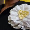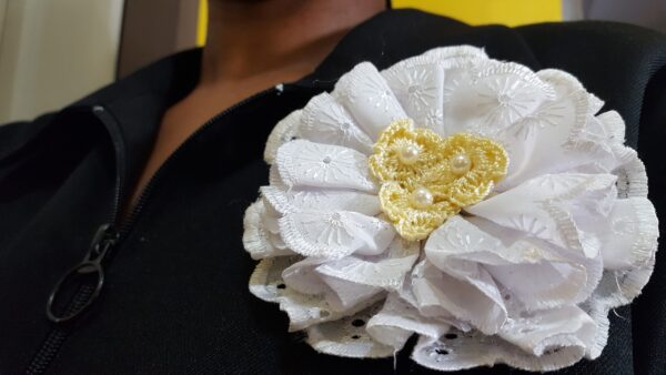 White Embroidery Lace Rosette With Decorative Pearls. Broach pin to the back. Just as in the photo accessorize your outfit and add to your style and swag.