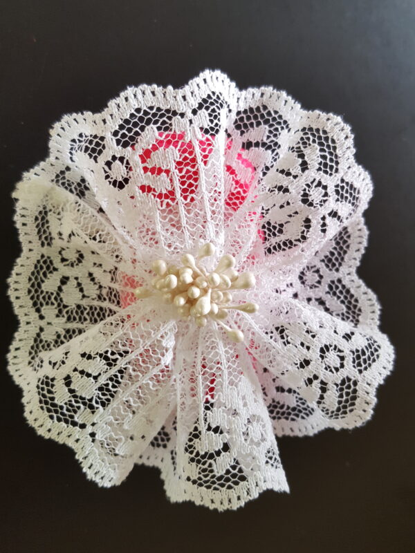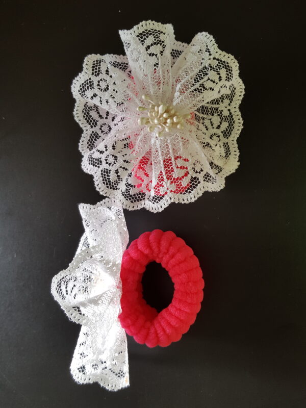 White Lace Hair Rosette With Red Scrunchie.  Adds That Elegance To Your Hair. Use Our Hair Bows And Rosettes To Add Your Own Personal Style.