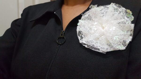 White Lace Rosette Broach With Decorative Pearl and Glitter. Broach pin to the back. Just as in the photo accessorize your outfit and add to your style and swag.