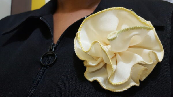 Yellow Rosset With Green Edge Trimming . Broach pin to the back. Just as in the photo accessorize your outfit and add to your style and swag.